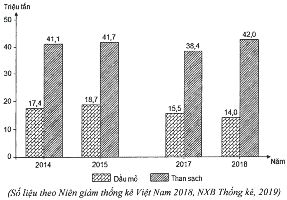 Câu 36: Cho biểu đồ về dầu mỏ và than sạch của nước ta giai đoạn 2014 – 2018: