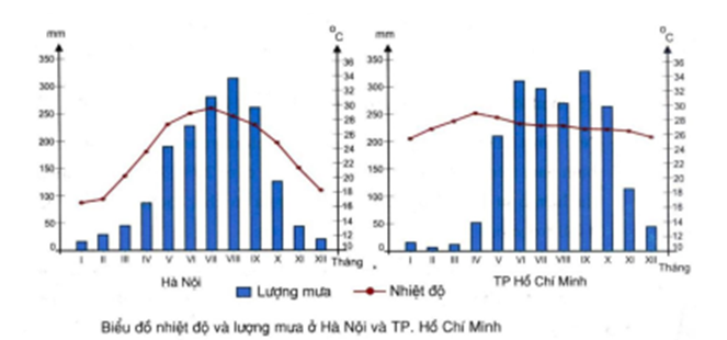 Dựa vào biểu đồ, hãy cho biết nhận xét nào sau đây không đúng khi so sánh chế độ nhiệt độ và lượng mưa của Hà Nội với TP. Hồ Chí Minh