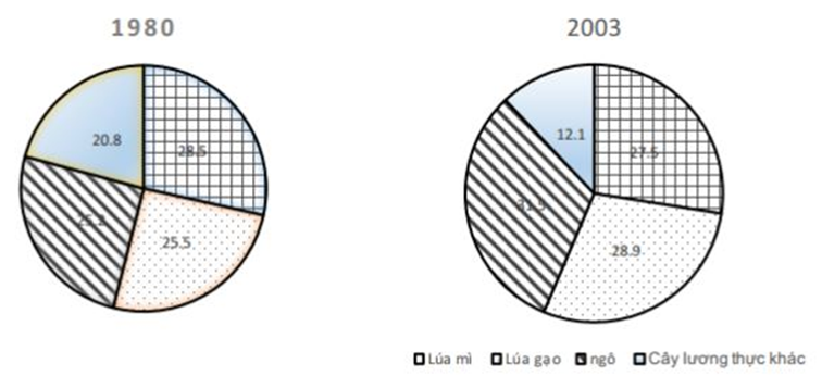 Nhận xét không đúng về cơ cấu sản lượng lương thực của Thế giới, thời kì 1980 - 2003 là?
