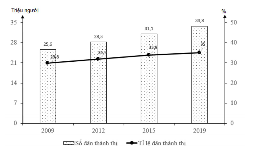 Câu 32: Cho biểu đồ về dân thành thị nước ta giai đoạn 2009 - 2019: