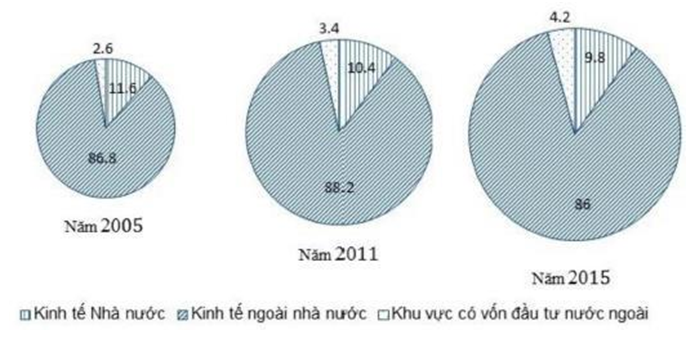 Kinh tế ngoài nhà nước khu vực có vốn đầu tư nước ngoài.Nhận xét nào sau đây đúng với sự thay đổi cơ cấu lao động 15 tuổi trở lên đang làm việc phân theo thành phần kinh tế của nước ta từ năm 2005 và 2015?
