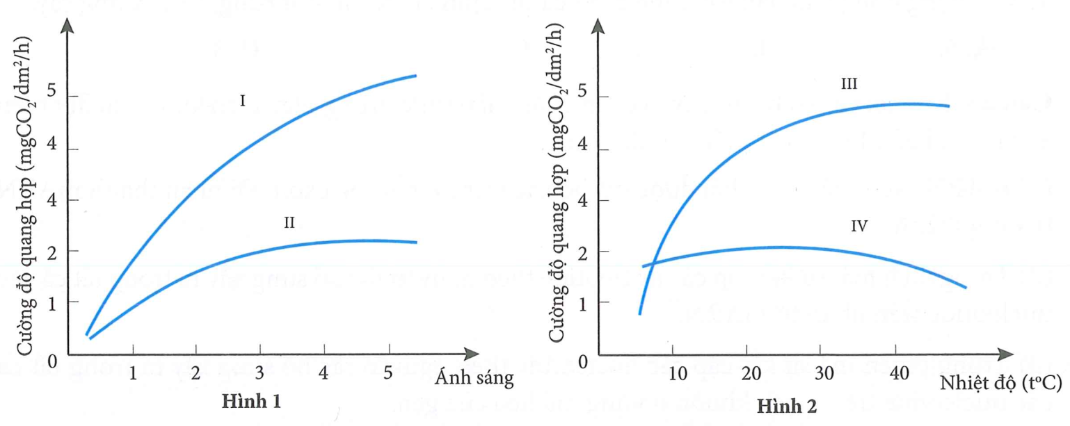 Câu 19: Cho sơ đồ về mối quan hệ giữa quang hợp của thực vật C3, C4 với cường độ ánh sáng (hình 1) và với nhiệt độ (hình 2). Hãy cho biết kết luận nào sau đây sau về đường cong của nhóm thực vật là đúng?