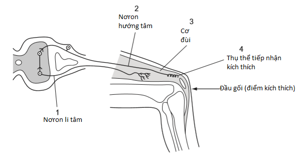 Khi tác động một lực vào đầu gối (vị trí kích thích), chiều truyền xung thần kinh là: