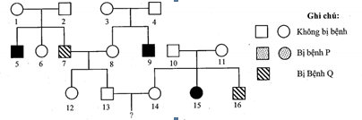 Biết rằng không có đột biến mới xảy ra ở tất cả các cá thể trong phả hệ. Xác suất cặp vợ chồng 13-14 sinh đứa con đầu lòng bị hai bệnh là bao nhiêu?