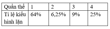 Câu 37: Ở một loài động vật ngẫu phối, xét một gen có hai alen, alen A trội hoàn toàn so với alen a. Có bốn quần thể thuộc loại này đều đang ở trạng thái cân bằng di truyền về gen trê và có tỉ lệ kiểu hình lặn như sau:
